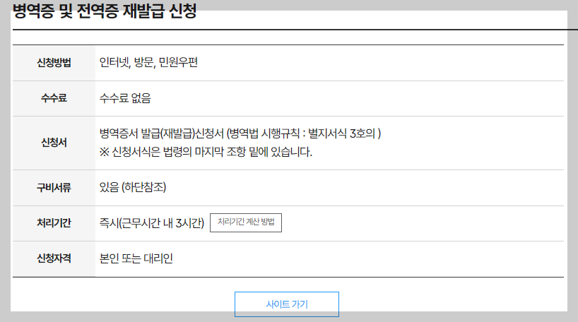 - 병무청 홈페이지 접속 → 예비군 편성 > 전역증 재교부