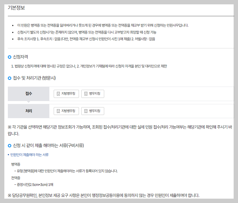 - 병무청 홈페이지 접속 → 예비군 편성 > 전역증 재교부