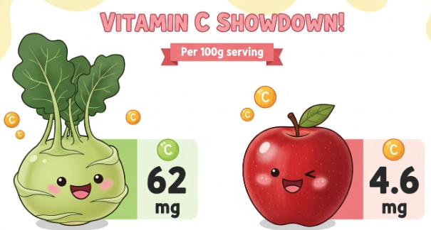 콜라비에는 놀랍게도 사과의 10배, 치커리의 5배에 달하는 비타민 C가 들어 있습니다.